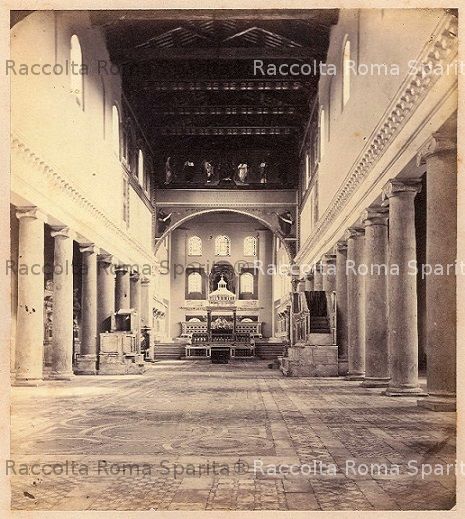 Descrizione: Basilica di San Lorenzo fuori le Mura, navata centrale, da ovest, AD 1230, con arco antico di trionfo, e mosaici Anno: 1864/66 Fotografo: Parker, John Henry Fonte: archivio sconosciuto Aggiunta da Carlo Celanetti