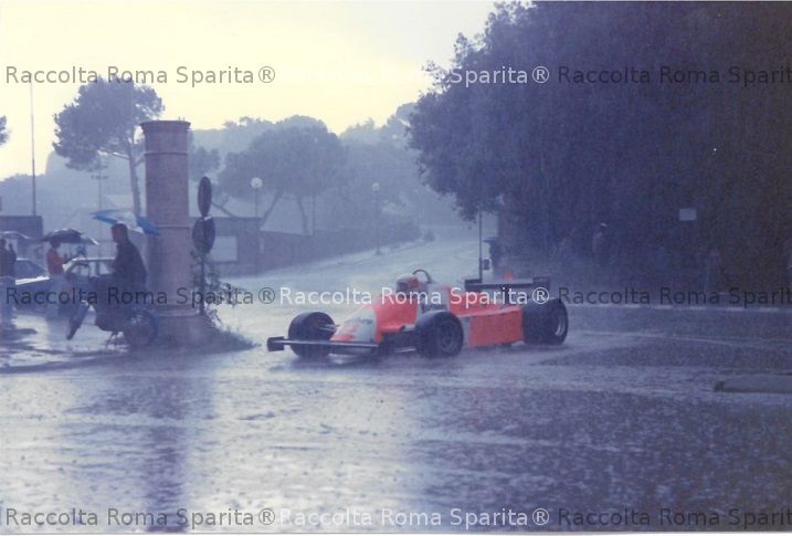 Descrizione: Rievocazione storica con vetture di Formula 1 nel vecchio circuito di Caracalla. Un forte ed improvviso acquazzone autunnale costringerà a sospendere la sfilata delle auto. Nello specifico, a temporale iniziato, sfila l’ ALFA ROMEO 179C con cui Bruno Giacomelli corse nel 1981