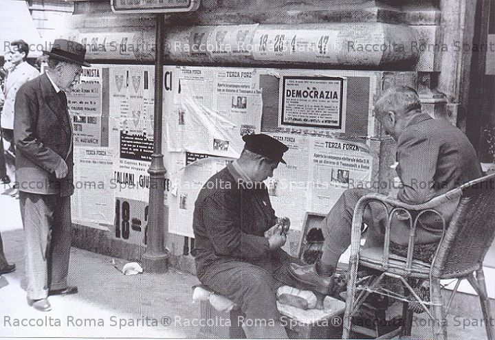 Lustrascarpe Descrizione: Lustrascarpe. Manifesti per le elezioni amministrative Anno: 1952 fotografo: (?) Fonte: Archivio Olivetti Aggiunta da Loredana Diana