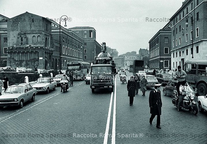 Descrizione: Via Petroselli. Il cavallo della Statua di Marco Aurelio durante il trasporto dal Campidoglio alla Sede dell’ISCR, nel complesso del San Michele, per il restauro Anno: 1981 Fotografo: (?) Fonte: ICCD Aggiunta da Loredana Diana