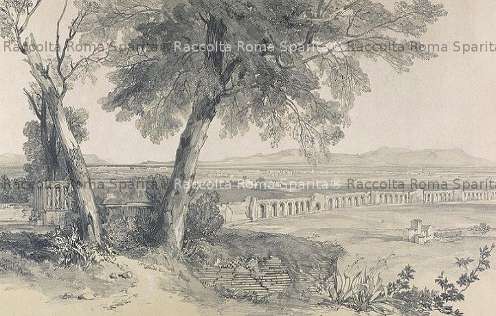 E si vede bene sulla sinistra il sarcofago delle Muse di Villa Mattei (poi sostituito con quello che reca un’imago clipeata di una coppia sorretta da due geni alati) alla fine del viale dei lecci.