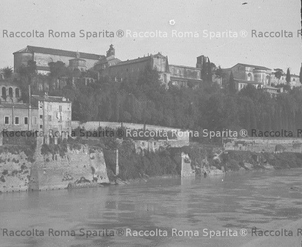 Descrizione: Aventino – Chiese di Santa Sabina e Sant’Anselmo viste dalla riva opposta del Tevere Anno: 1910 ca Fotografo: (?) Fonte: Archivio personale Aggiunta da Ivano