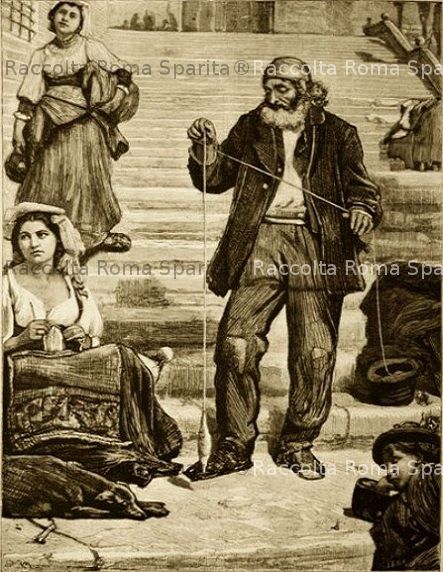 Descrizione: Sulla gradinata dell’Ara Coeli, una donna che lavora a maglia, un uomo con un fuso e un filo Anno: 1874 Autore: (?) Fonte: Da “Nuova illustrazione Universale” del 5 aprile 1874 Anno 1, n. 18 Aggiunta da Remia Marcello