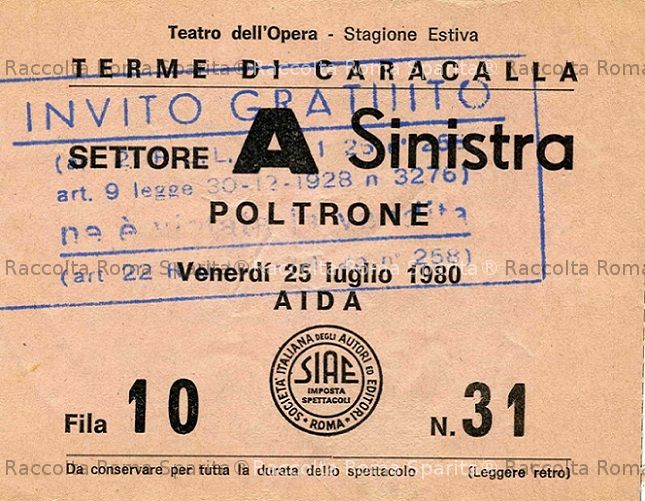 Descrizione: Biglietto d’invito del Teatro dell’Opera di Roma per la rappresentazione dell’Aida alle Terme di Caracalla Anno: 25 luglio 1980 Fonte: Archivio personale Aggiunta da Stefano Farina