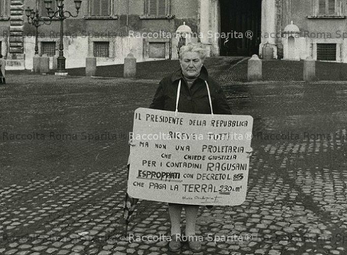 Descrizione: Maria Occhipinti protesta davanti al Quirinale. Maria Occhipinti (Ragusa 1921- Roma 1996) Comunista, poi anarchica, antesignana del femminismo, pacifista, apolide per necessità, la Occhipinti lega il suo destino ai fatti del “Non si parte” scoppiati a Ragusa nel 45 dopo la nuova coscrizione. Incinta di 5 mesi, non esita a gettarsi davanti alle ruote di un camion militare perbloccare il rastrellamento dei giovani renitenti alla leva. Per questa plateale protesta sarà incarcerata, confinata, schedata a vita dalla polizia come sovversiva, condannata senza appello dalla famiglia e anche dal Partito Comunista. Costretta a lasciare la Sicilia a girare per il mondo insieme a sua figlia, tornerà nella sua Ragusa ormai anziana, dopo aver scritto due intensi romanzi autobiografici, “Una Donna di Ragusa” e “Una Donna Libera”