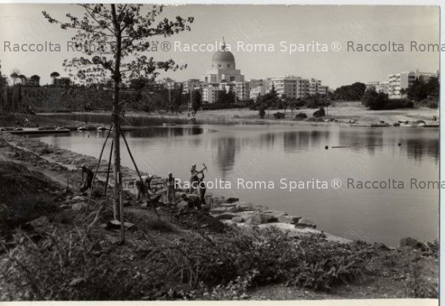 Descrizione: EUR. Sistemazione del lago artificiale. Nel 1955 l’allora Ente Eur decise di riprendere e terminare i lavori iniziati prima della guerra, dotando la zona circostante di una consistente riserva idrica in funzione antincendio. I lavori terminarono proprio in occasione delle Olimpiadi di Roma del 1960