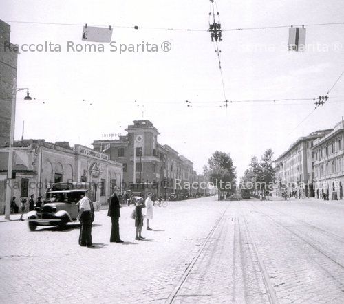 Sulla sinistra l’imbocco di Via Pellegrino Matteucci, con i binari del tram della linea per la Garbatella. Gli edifici lungo il lato sinistro nel tempo vennero sostituiti dai “palazzoni” che ben conosciamo…
