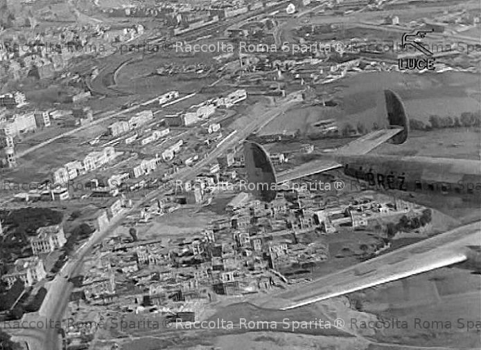 Descrizione: Volo dimostrativo su Roma del quadrimotore di produzione italiana Breda BZ308 matricola I-BREZ condotto dal famoso collaudatore Mario Stoppani.. Le immagini del fotogramma consentono la visione dall’alto della via Portuense nel tratto compreso tra l’Ospedale Spallanzani (al centro a sinistra) e Largo Volontari del Sangue (in basso a sinistra).Sullo sfondo si intravede la Stazione ferroviaria di Trastevere.