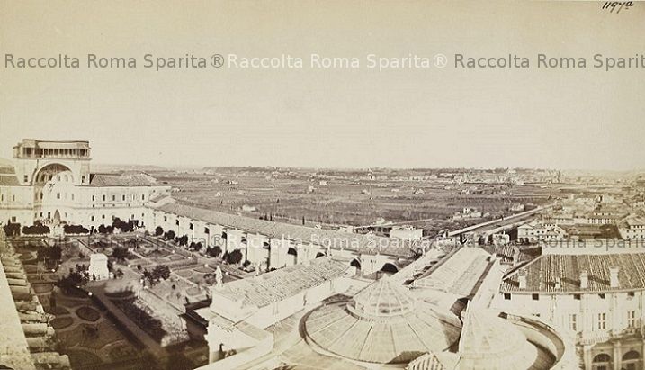 Descrizione: Vista dai Palazzi Vaticani, si riconosce il cortile della Pigna e una vasta zona ancora non edificata, dove sarebbe poi sorto il quartiere Prati