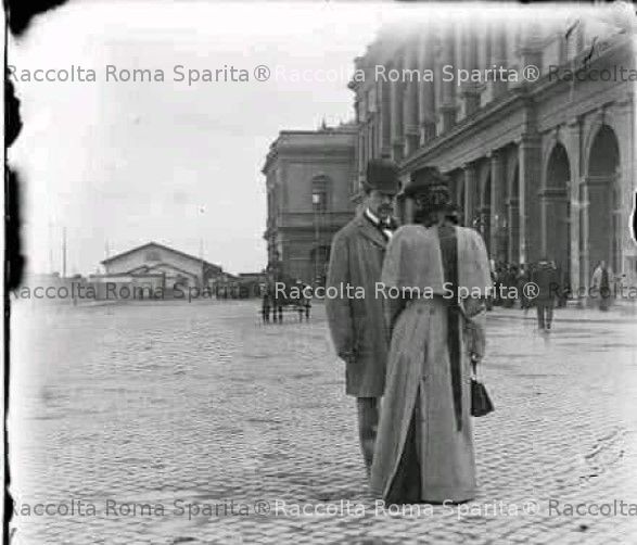 Descrizione: Un gentiluomo e una dama conversano sul piazzale laterale della Stazione Termini, presso Via Giolitti Anno: 1890 Fotografo: Primoli Fonte: archivio Primoli Aggiunta da Carlo Grossi
