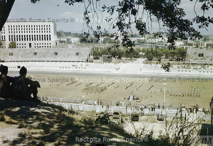 Descrizione: Militari alleati schierati all’interno dello Stadio dei Cipressi, futuro stadio Olimpico. Sullo sfondo a sinistra il palazzo della Farnesina attuale sede del Ministero degli Esteri. Anno: Luglio 1944 Fotografo: (?) Fonte: Imperial War Museum Aggiunta da Nicola Capece