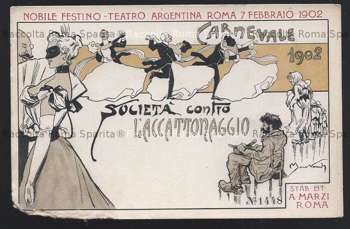Descrizione: Biglietto di Partecipazione al “nobile festino Teatro Argentina” da parte della Società contro L’Accattonaggio nel carnevale 1902 Anno: 7 febbraio 1902 Fotografo: (?) Fonte: Tratta da ebay archivio sconosciuto Aggiunta da Marcello Remia
