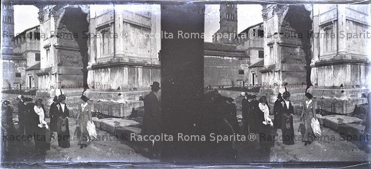 Descrizione: Foro Romano. Visitatori ai piedi delll’Arco di Tito, sullo sfondo il campanile di Santa Francesca Romana/Santa Maria Nova Anno: primi del 900 Fotografo: (?) Fonte: Tratta da ebay archivio sconosciuto Aggiunta da Marcello Remia