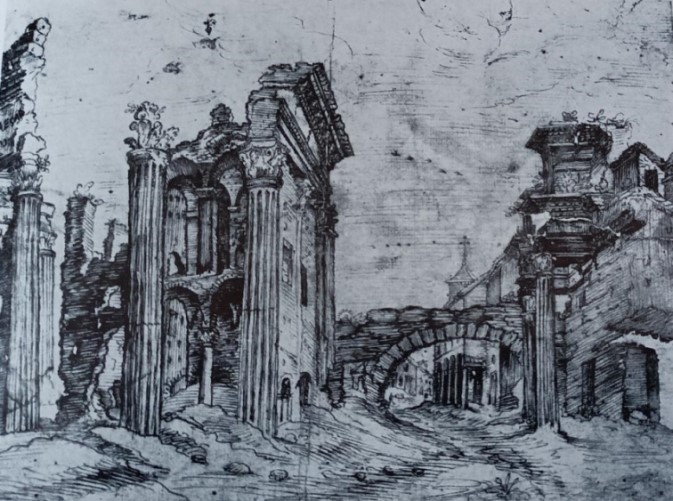 Descrizione: Foro di Nerva, penna e inchiostro seppia. A destra le colonnacce, a sinistra il tempio di Minerva, dietro il campanile dei Santi Quirico e Giulitta. Il disegno è forse una copia con qualche variante di un disegno di Jan Bruegel