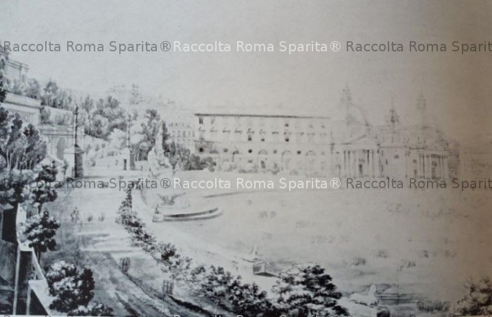 E’ lo studio preparatorio per la stampa “Veduta del Monte Pincio e della Gran Piazza del Popolo” della serie “I sette colli di Roma”. E’ presa dall’interno del convento di Santa Maria del Popolo, ed è una delle prime vedute dopo la sistemazione urbanistica di Valadier