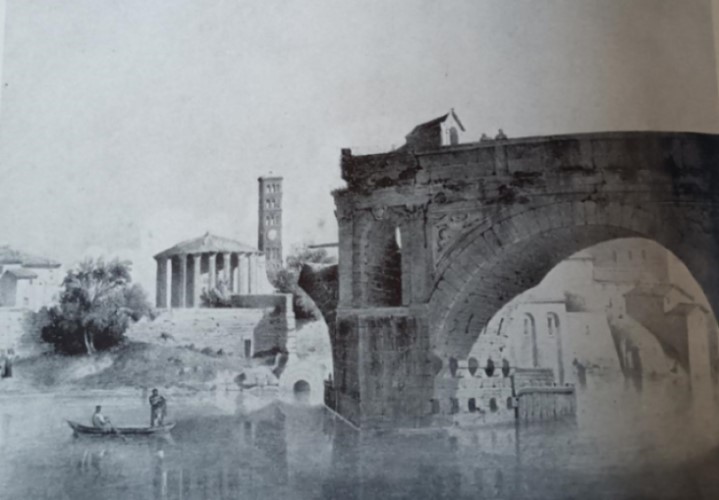 Descrizione: Ponte Rotto, Tempio di Ercole Oleario (o Invitto o Vincitore) detto erroneamente Tempio di Vesta, e Santa Maria in Cosmedin (didascalia originale: Ponte Rotto, Tempio di Vesta e s. Maria in Cosmedin)