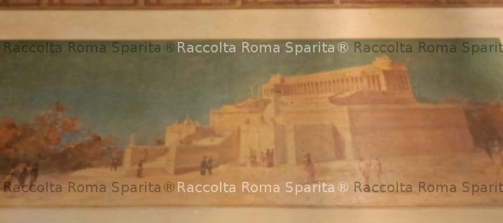 Descrizione: Vittoriano. Il dipinto si trova nell’androne dell’edificio dell’Acquario Romano, inaugurato nel 1885. Appare semplificato rispetto al contesto reale in cui si trovava il monumento in quegli anni, sembra giganteggiare in un paesaggio deserto. Mancano ancora le quadrighe in bronzo sull’attico, aggiunte successivamente, solo nel 1924