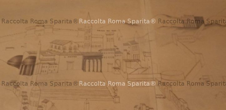 Riproduzione grafica, alla stessa scala, effettuata da Giovan Battista De Rossi nella seconda metà dell’800 di un dipinto su tela del 1538 presente nel palazzo Comunale di Mantova (ex palazzo Ducale), che rappresenta Roma tra il 1478 e il 1490