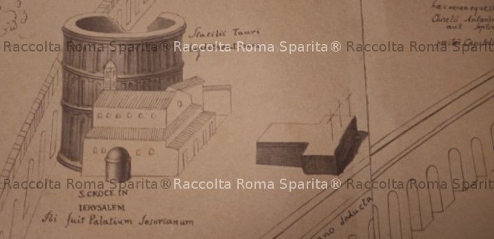 Descrizione: Particolare con Santa Croce in Gerusalemme (ante rifacimento facciata del XVIII secolo), con l’anfiteatro castrense (detto erroneamente “di Statilio Tauro”)