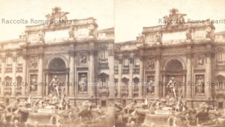 Descrizione: Stereografia della Fontana di Trevi. Realizzata dallo Studio Fotografico Lorenzo Suscipj. Fotografo molto famoso ai suoi tempi, (1802-1855 data della morte incerta, viene datata da alcuni nel 1885, da altri nel post 1893, o addirittura nel 1901) è stato tra i primi ad adoperare il “Dagherrotipo”, e fu il primo a realizzare un foto panoramica di Roma realizzando otto dagherrotipi 30 x 35 cm dall’alto della chiesa di San Pietro in Montorio. Alla sua morte l’attività dello studio fotografico fu portata avanti dalla moglie Virginia De Andreis e dai suoi figli fino ai primi anni del 900. (notizie Wikipedia)