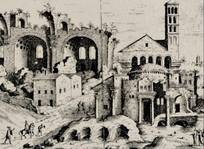Descrizione: Raffigurazione risalente al XVI secolo con il c.d. Tempio di Romolo (all’epoca vestibolo di ingresso della chiesa dei SS. Cosma e Damiano) e la Basilica di Massenzio. Compare ancora il campanile, che crollò nei primissimi anni del ‘600 (prima del 1610). L’immagine è “specchiata”