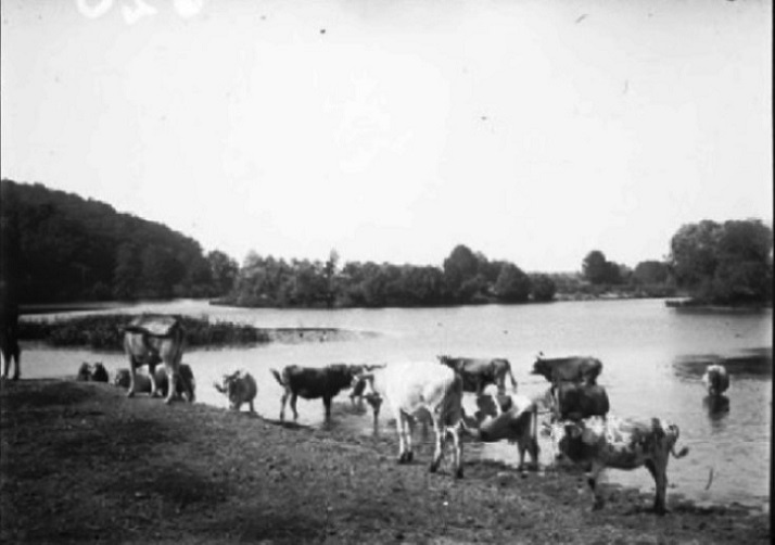 Descrizione: Ostia. Mandria di mucche si abbevera nello stagno del Guerrino nella zona paludosa, oggi scomparsa, della tenuta Chigi, a Castelfusano