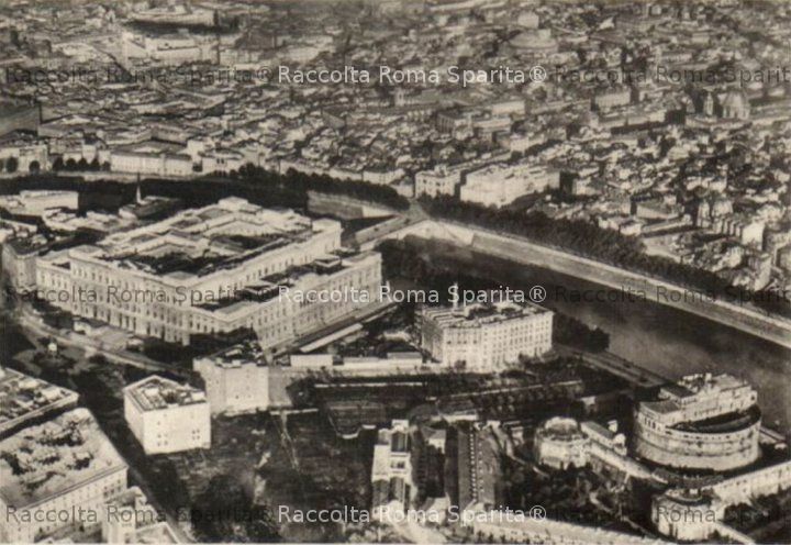 Descrizione: Palazzo di Giustizia e Castel Sant’Angelo. Foto scattata da un dirigibile Zeppelin. Anno: Anni ’20 Fotografo: (?) Fonte: Tratta da ebay archivio sconosciuto Aggiunta da Carlo Galeazzi