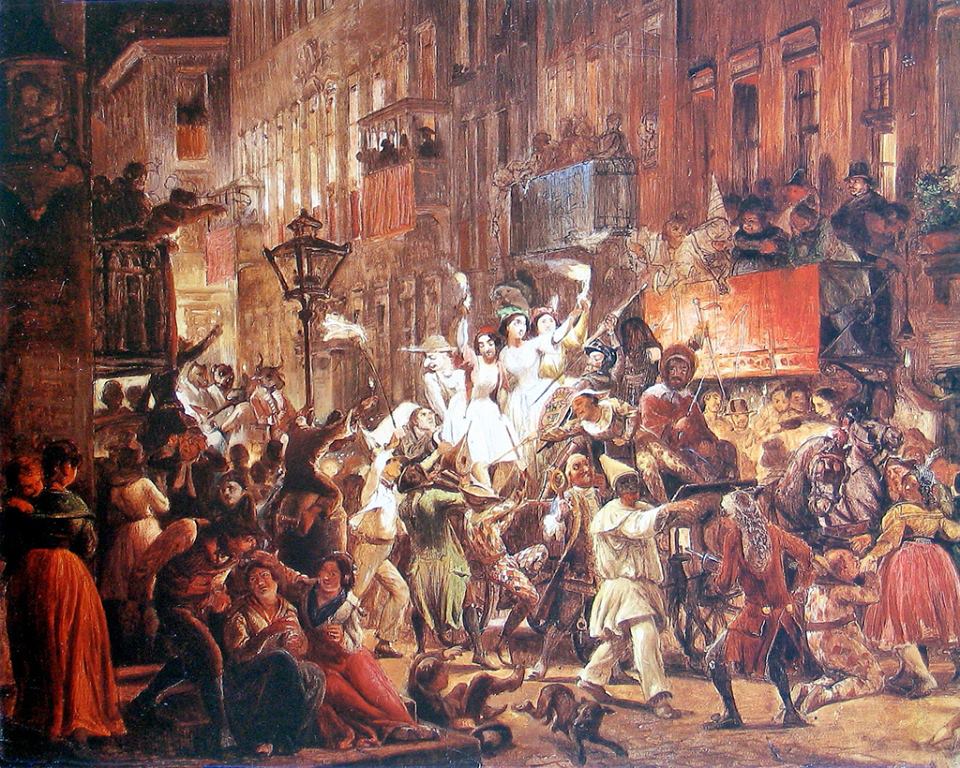 Tutte le classi, tutte le età sono in armi l’una contro l’altra. Si sale sopra il predellino delle vetture: non c’è lume appeso che sia sicuro; tutt’al più qualche fanale; il bimbo spegne il moccolo a suo padre e non cessa di gridare: “sia ammazzato il signor padre!”. E’ inutile che questi gli rimproveri una simile sconvenienza; il bimbo si appella alla libertà di questa serata e continua ad imprecare con maggiore vivacità. Come poi il baccano si va calmando alle due estremità del Corso, più furioso si accentua nel centro, dove la calca ora sorpassa ogni immaginazione, tanto che anche la memoria più ferrea non riesce a rappresentarsela.