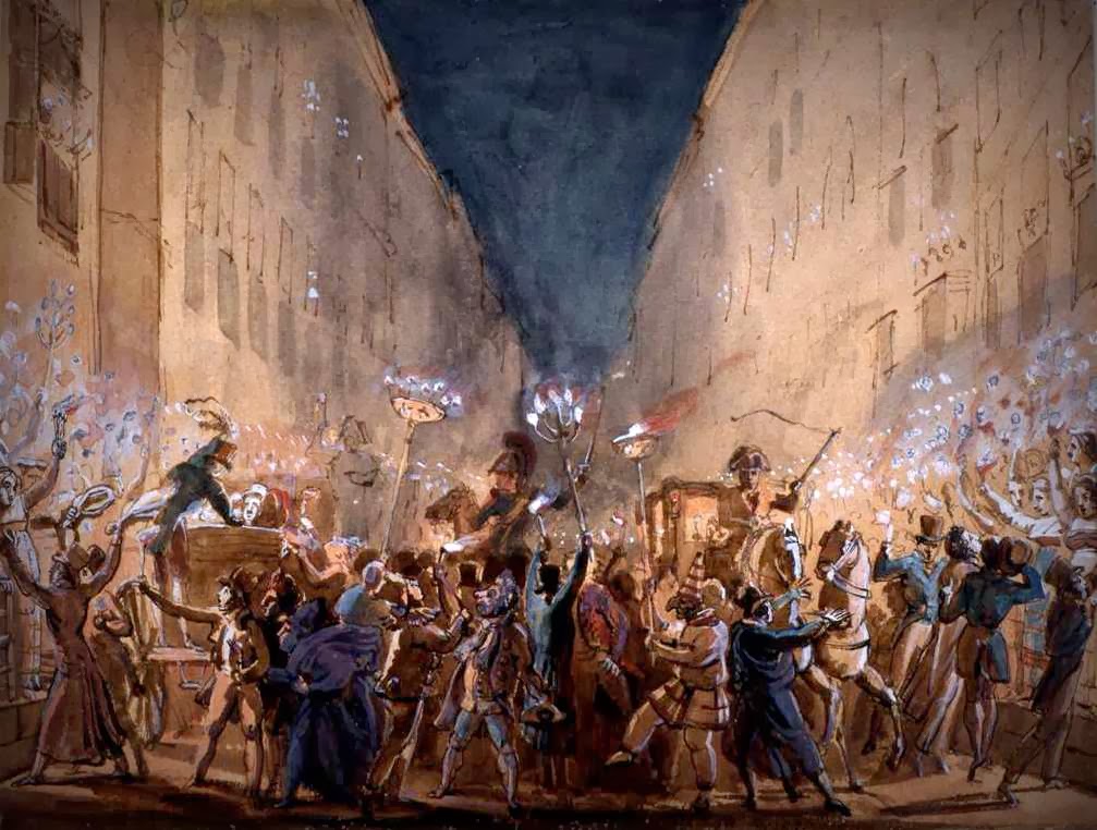 Il popolino adesso accorre a deliziarsi a una tavola ben apparecchiata e a gustarvi fino a mezzanotte di quelle carni che ben presto saranno proibite; il bel mondo si riversa nei teatri, per dire addio alle rappresentazioni date finora non senza molti tagli. E anche a questi piaceri pone un suggello la mezzanotte imminente”.