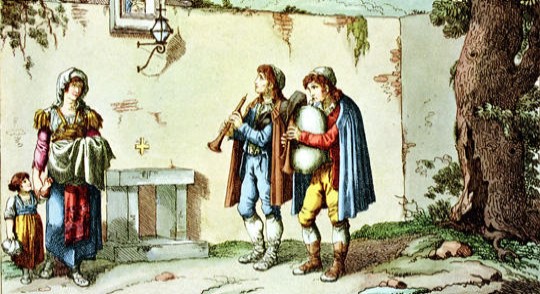 Il giorno di Santa Caterina, il 25 novembre, dall’Abruzzo, ma anche dal Lazio, Campania, Lucania, Calabria e perfino dalla Sicilia arrivavano a Roma gli zampognari a riempire l’aria delle loro melodie in attesa del Natale. Il loro abbigliamento tipico era caratterizzato da pantaloni corti, giacca di fustagno, ampio mantello o un pelliccione, berretto a calza con fiocco e cioce ai piedi. Solitamente arrivavano in coppia o in trio, il più anziano con la zampogna vera e propria, un altro con la ciaramella o altri strumenti a fiato e un altro ancora con il canto e tradizionalmente si trattava di pastori o contadini che si trasferivano temporaneamente in città per il periodo natalizio.