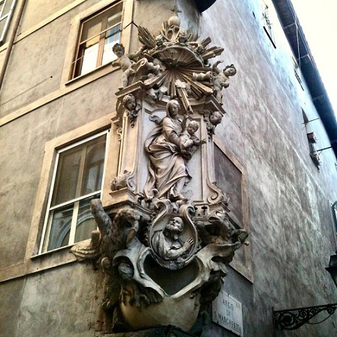 L’edicola di Via del Pellegrino, angolo Arco di Santa Margherita, è una delle edicole barocche più famose di Roma. Fu realizzata nel 1716, in stucco, da Francesco Moderati, scultore e stuccatore abbastanza famoso all’epoca, su commissione del Cardinale Pietro Ottoboni. La statua della vergine con il bambino in braccio è coronata da un fastigio ornato da due angioletti. Nel medaglione sotto la statua è invece raffigurato San Filippo Neri affiancato da una coppia di aquile a due teste, simbolo della famiglia committente degli Ottoboni