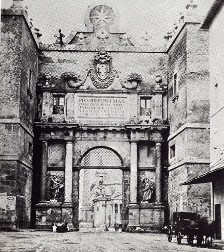 Questa Porta cambiò più volte nome. Da Porta Flaminia, denominazione assunta allorché Aureliano la fece costruire, a Porta San Valentino nel primo medioevo, all’ultima Porta del «Popolo». Per quanto riguarda la struttura, la prima antica rimasta, risale a Pio IV e venne eretta fra gli anni 1562 ed il 1565 da Nanni di Baccio Bigio. C’è chi dice con lo zampino di Michelangelo. Le colonne ai lati sono antiche, tratte da chissà quale monumento. Le statue di Pietro e Paolo sono opera del Mochi. I fornici laterali furono aperti soltanto nel 1879 benché i lavori fossero incominciati nel 1643. Per aprirli, fu necessario demolire le due torri – che si vedono nella foto – e che fiancheggiavano l’antica porta, fatte costruire da Onorio