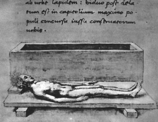 Il 18 aprile 1485 in un terreno del convento di S. Maria Nuova, sulla via Appia, oltre il mausoleo di Cecilia Metella, fu ritrovato da alcuni muratori lombardi, all’interno di un monumento funerario, un sarcofago marmoreo ermeticamente chiuso, in cui si trovava, conservato miracolosamente con un aspetto vitale, grazie a una particolare mistura, il corpo di una giovane fanciulla tra i 12 e i 15 anni, il cui nome era indicato in un’epigrafe come «Julia filia Claudi». Aveva capelli biondi, sostenuti da una specie di cuffia o benda, occhi e bocca leggermente aperti, denti bianchi, colorito vivo, guance carnose e le membra ancora mobili. Esposta pubblicamente sul Campidoglio nei giorni successivi, suscitò grandissimo scalpore non solo a Roma ma anche in regioni lontane, e provocò un vero e proprio pellegrinaggio, fino a che, divenuta nera a causa dell’effetto dell’aria, per ordine di Innocenzo VIII, per il quale era divenuto increscioso il culto quasi pagano nei suoi confronti, venne segretamente sotterrata fuori di porta Pinciana