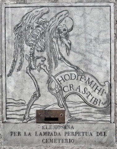 Il mese dei morti. Nella Roma di un tempo novembre era dedicato a solenni cerimonie funebri, allestite un po’ ovunque in ricordo dei “defunti di Cristo”: la più importante si svolgeva nella chiesa di S. Maria dell’Orazione e Morte in Via Giulia. Nella cupa atmosfera di una chiesa tappezzata di drappi neri, ceri accesi e fiori veniva esposto un catafalco composto di ossa e teschi, a simboleggiare i temi della morte e della salvezza. Come se non bastasse, due scheletri con clessidra e falce ammonivano: “Ancor noi fummo/ come voi/ che qui venite…”. Queste macabre rappresentazioni colpivano la popolazione romana, che nel Sette-Ottocento si recava in massa nella sotterranea cappella della chiesa, simile al cimitero dei Cappuccini in Via Veneto. Al termine delle cerimonie la statua della Madonna del Rosario veniva portata in processione fino al cimitero del S. Spirito.