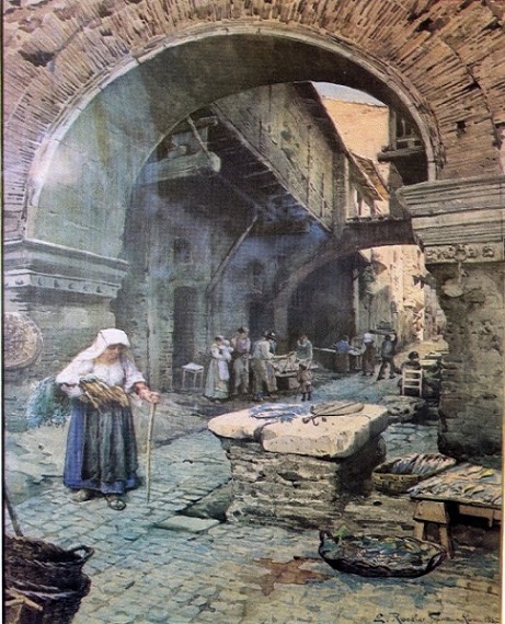 Sia pure in tono dimesso, il mercato del pesce è in pieno svolgimento. La donna che s’appoggia al bastone, in primo piano, ha fatto tuttavia altre compere, ma non s’avvertono più sotto quelle arcate, le voci, il clamore, di qualche tempo prima. Le voci dei «cottiatori». Cioè i banditori ai quali veniva allora affidato il compito di fissare i prezzi della giornata. Da cottìo, forse di derivazione latina (quotus, quoties, quotiate o cotidie), passato poi ad indicare, specialmente durante le festività natalizie, lo stesso mercato all’ingrosso del pesce. Nel suo più vero significato corrispondeva all’«apprezzamento del pesce in pescheria, che si fa la mattina quasi con le leggi di un pubblico incanto», secondo la misurata definizione del Belli posta proprio in nota ad un suo sonetto, Er Coltivo. E l’operazione si svolgeva in osservanza di rigorose norme, che, per delicatezza di procedura, e per il particolare oggetto delle disposizioni, vennero più volte richiamate, ri