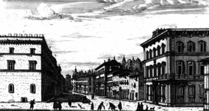 Sullo sfondo non sono ancora iniziati i lavori di completamento di Palazzo Altieri, cioè quella che sarà la parte settecentesca su via degli Astalli.