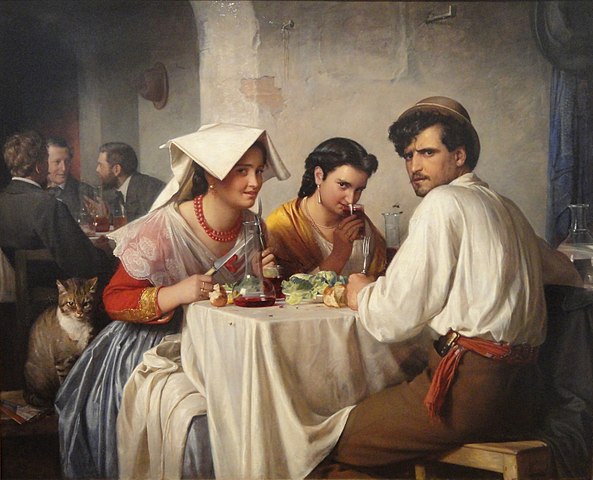 Il quadro è bellissimo: lo sguardo rivolto al pittore come se stesse facendo una fotografia invece di dipingere. Minaccioso, con una punta però di distaccato e rispettoso compiacimento. La forchetta tenuta quasi come avvertimento. Dietro, gli “avvocati” in “pausa pranzo” sorridono: fa un certo effetto veder sorridere dei volti di metà ‘800 riprodotti allora.