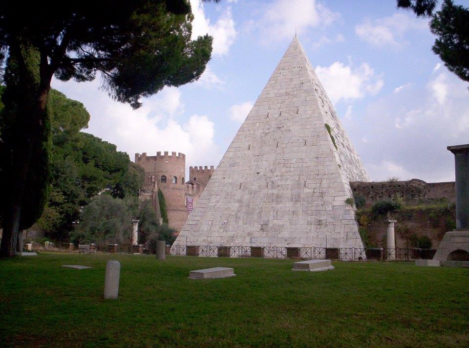 Uno dei monumenti più insoliti di Roma è la Piramide di Caio Cestio: si tratta di un sepolcro monumentale sorto in età augustea quando, a seguito della conquista dell’Egitto, si diffuse la moda “egittizzante”. Il ricco commerciante di prodotti tessili Caio Cestio, tra il 18 e il 12 a. C. si fece erigere in soli 330 giorni questa tomba: fu usato il conglomerato cementizio per il nucleo, che fu poi rivestito da mattoni e infine da una copertura esterna in lastre di marmo di Carrara.